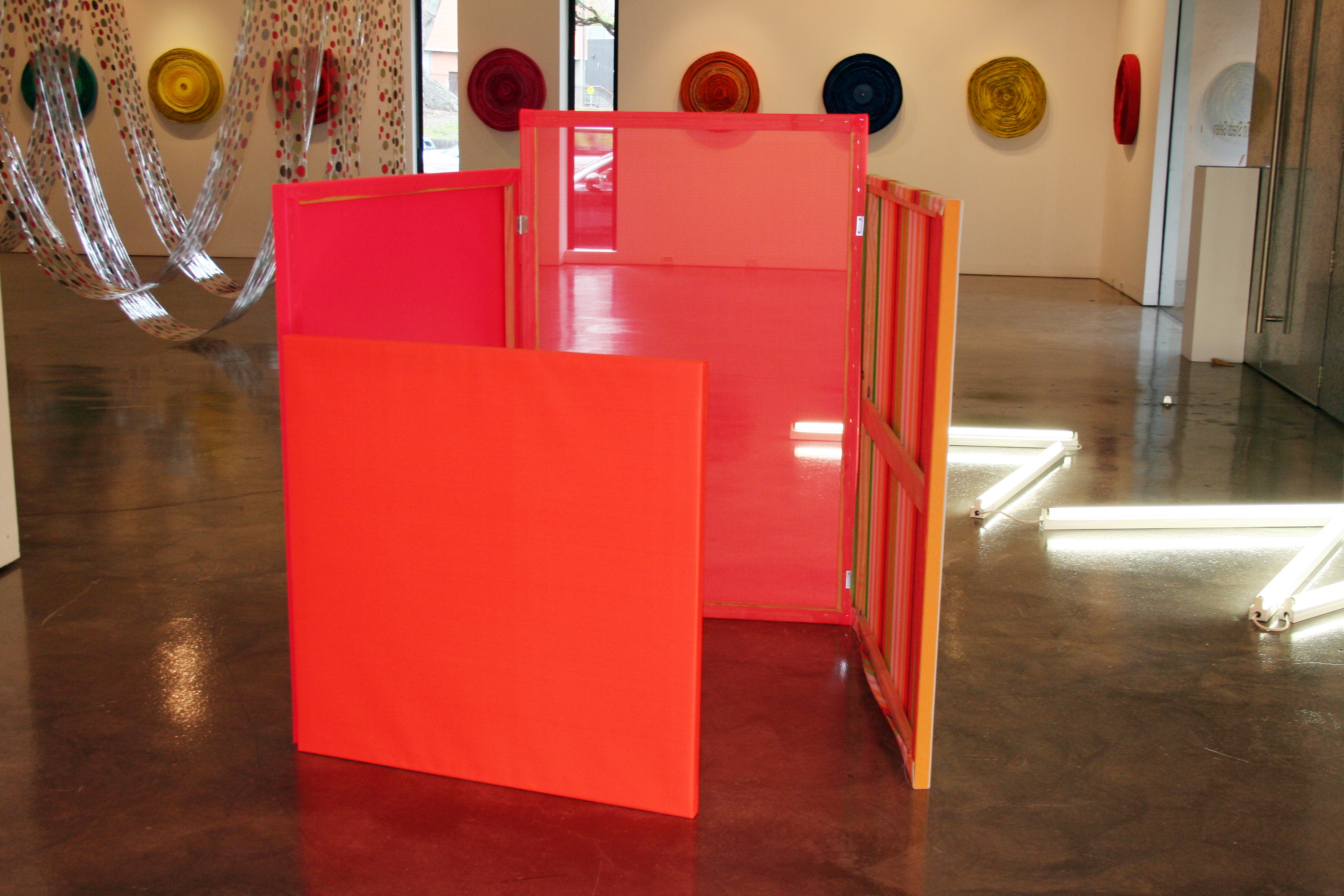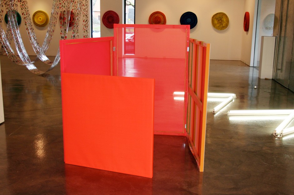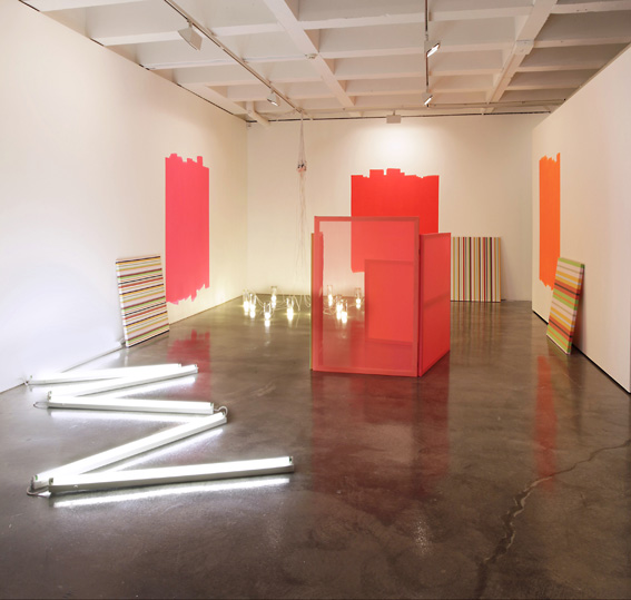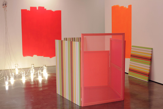 Image: ‘minimalismo’, canvas stretchers, fabric, vinyl, fluorescent lights, acrylic wall paint, glass jars, dimensions variable.