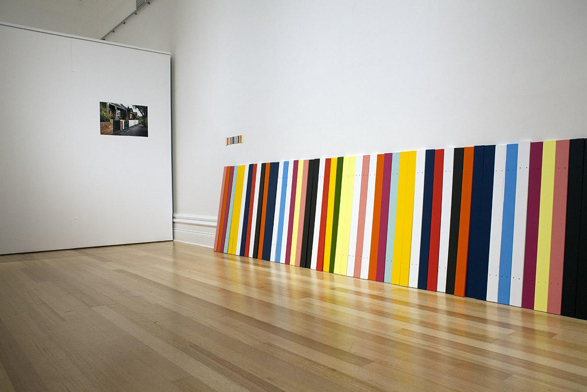 ‘fence fragment III’, acrylic on wood, fabric, photographic image, 1.2m x 6m (approx.), 2014.